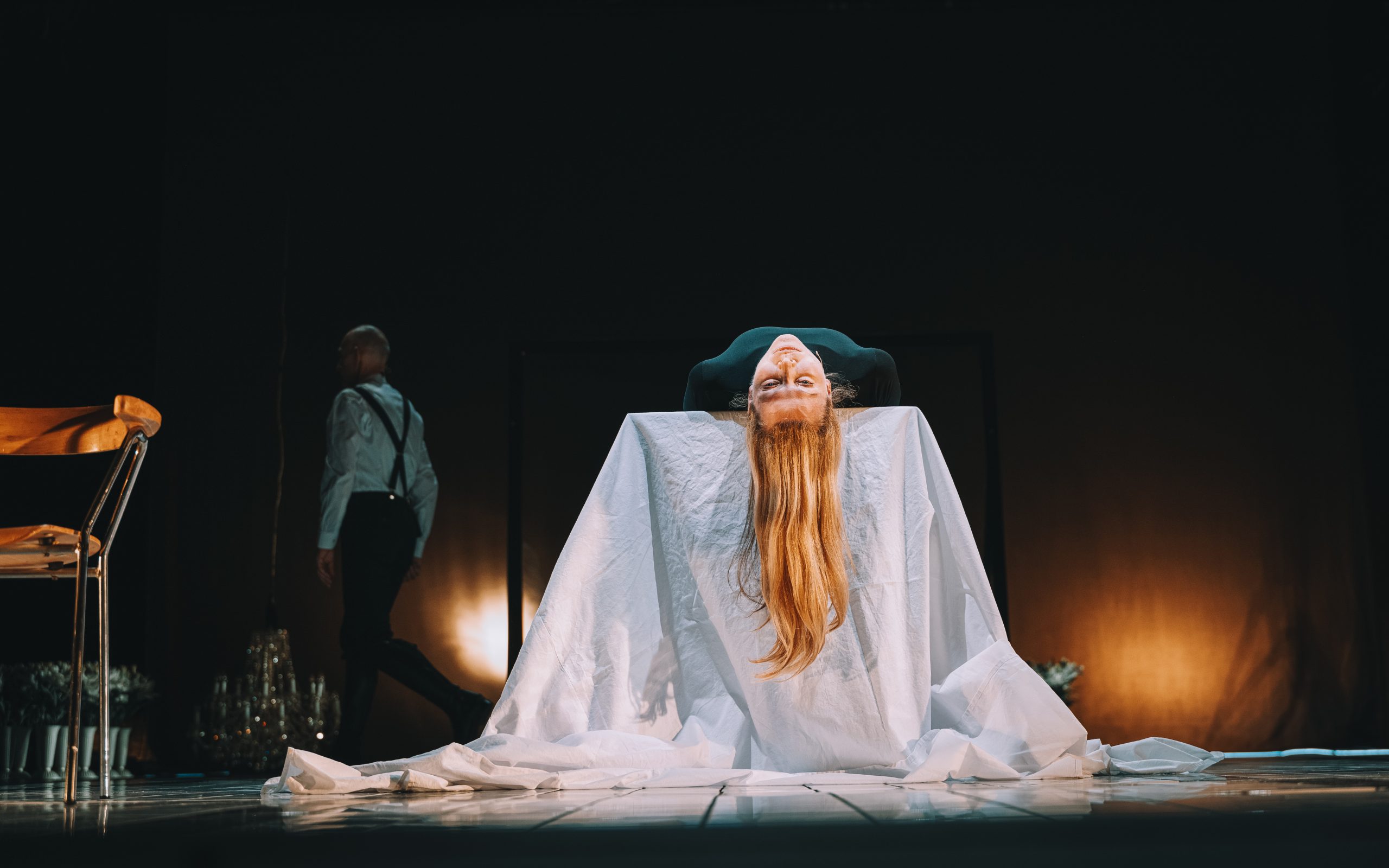 Mary’s courage in this production is articulated not through overt rebellion, but through a sustained ethic of perseverance and endurance. The death sentence that shadows her from the outset does not reduce her to passivity; rather, it becomes the generative principle of the drama’s inner movement. Her trajectory unfolds as a gradual divestment – of body, name, and voice – yet this process of dispossession remains inseparable from a concurrent movement of inner consolidation. Her final victory is neither political nor strategic, but ethical: the achievement of a dignified end. Death thus emerges as the sole force that transcends both the system and the human ego, marking the point at which power relinquishes its hold and the individual, paradoxically, attains freedom.